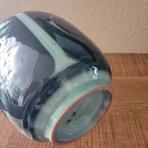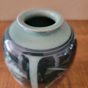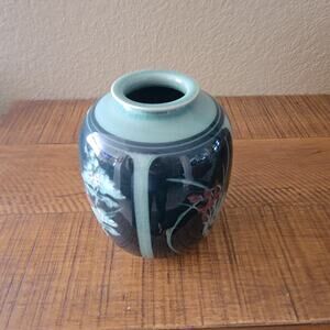 This vintage hand-painted ceramic vase features a classic rounded form with a narrow mouth and detailed floral decoration. Measuring approximately 6.75 inches tall and 4.5 inches wide, the piece is finished in a glossy glaze with panels of soft green and deep charcoal framing hand-painted flowers in muted tones of red, white, and green. The rim is accented in a pale celadon glaze, adding subtle contrast to the darker body. The floral motifs, combined with the traditional form, give the vase a timeless quality that blends Asian-inspired decorative style with modernist simplicity. Perfectly sized for small arrangements or for display as a decorative object, this vase can enhance a shelf, mantel, or tabletop. In very good vintage condition with age-appropriate wear, it reflects fine craftsmanship and artistic detailing. A collectible and versatile accent piece, ideal for lovers of hand-painted ceramics and vintage decorative arts.