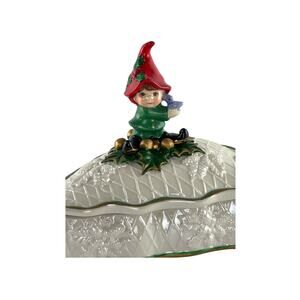 A charming hand painted porcelain dish by Cracker Barrel, shaped like a Christmas tree. Features a festive pixie elf lid, ideal for decorative storage.