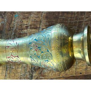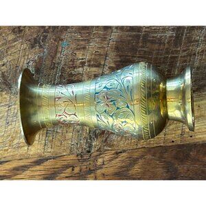 Vintage Hand Painted Etched India Brass Vase 4.5" Tall Floral Design