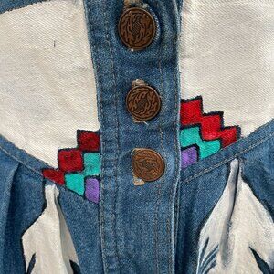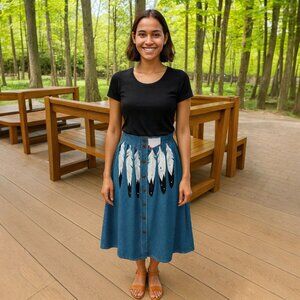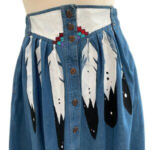 Add a true one-of-a-kind piece to your wardrobe with this vintage hand-painted denim skirt featuring a bold feather motif and Southwest-style embroidered accents. The front button-down closure and full A-line shape give this skirt a flattering, flowy silhouette that works for all seasons.