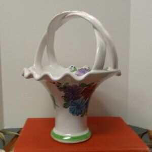 Very pretty hand painted basket made in Portugal. On the bottom is states Vestal, I am not sure if that is name of person who made it or what? It has a woven handle, and is in great condition. No chips or cracks. It measures 9 1/2" tall and 6" wide. I am also not sure of year made, I know my mother-in-law had this in her home since the 60's.