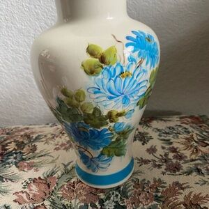 Vintage Hand Painted Floral Blossoms Ceramic Vase with Blue Accents 9.5”H