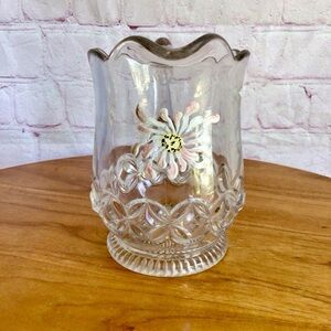 Charming clear glass pitcher with hand painted floral accents. This pitcher features a scalloped rim and a distinct diamond pattern around the bottom. This piece adds elegance to any table setting. The floral does have wear as shown in the photos. Measurements are approximately 5” tall, 5 1/2” wide including the handle. Good vintage condition. No cracks or repairs. There are some light surface scratches from use as well as a few tiny chips smoke free home.