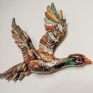 Vintage Hand Painted Flying Pheasant Chalkware Wall Art w/ Drip Glaze Finish. Artist initials on back.