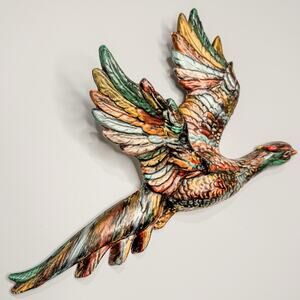 Vintage Hand Painted Flying Pheasant Chalkware Wall Art w/ Drip Glaze Finish