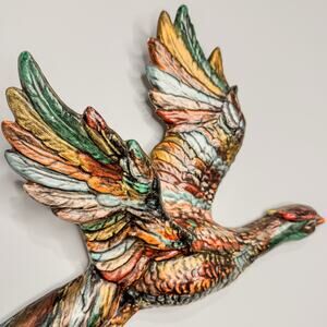 Vintage Hand Painted Flying Pheasant Chalkware Wall Art w/ Drip Glaze Finish. Artist initials on back.