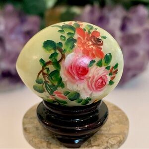 Vintage Hand Painted Green Jade Egg w Flowers Bird & Pink Roses Wood Stand 1.5".