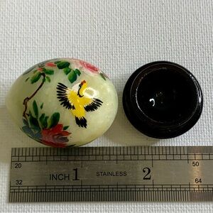 Vintage Hand Painted Green Jade Egg w Flowers Bird & Pink Roses Wood Stand 1.5"