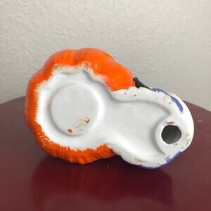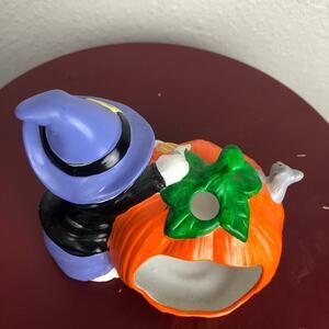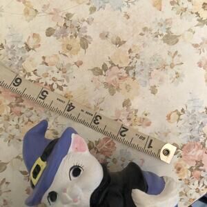 • Vintage handpainted decor featuring white cat in witch hat with a jack-o-lantern. Vintage Halloween stuff is my favorite! No chips or cracks but has some flaws to the paint job.