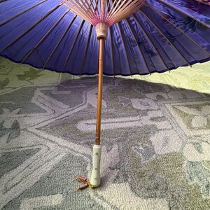 The Vintage Hand Painted Japanese Chinese Bamboo Wood Umbrella Parasol is a unique and traditional accessory that combines functionality with artistic flair. Handmade in Japan, this original piece features intricate hand-painted designs in shades of purple, giving it a distinctive Art Deco look. Crafted from wood, this adult unisex parasol exudes a sense of elegance and charm, making it a standout addition to any vintage-inspired ensemble.