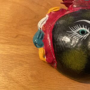 Fun vintage mask. Mexican coconut shell with decorative headdress and hand painted face. In good condition see pictures for details. Nice mask to add to a collection. The headdress is fairly spiky at the top. Measurements taken of the back of the mask. Height at tallest approximately 7 inches. At widest approximately 5.5 inches.