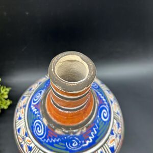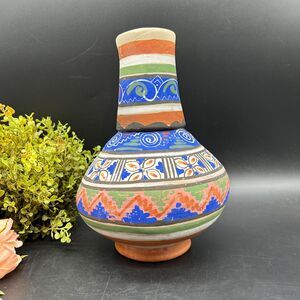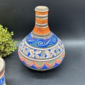 Vintage Hand Painted Mexican Unglazed Pottery Water Jug and cup. Gorgeous water pitcher with a cup. Marked Mexico on the underside of the jug. There are no cracks or chips. The jug measures about 8 3/4” high and about 6 1/2” wide, the cup measures about 4 1/4” high and fits neatly on top of the jug. The pottery comes with its usual, normal scratched surface. Please see all photos.