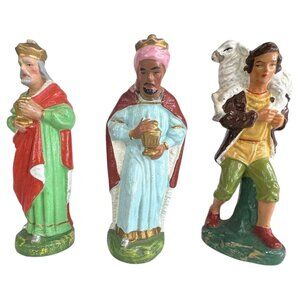 This vintage nativity set features eight hand-painted figurines including the Holy Family, Wise Men, Angel, Shepherd, and animals.