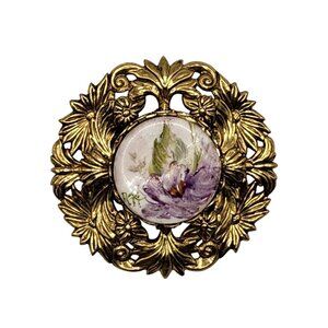 This vintage hand-painted porcelain floral brooch features a delicate purple flower centerpiece set in a beautifully detailed gold-tone filigree frame. Measuring approximately 1.9" in diameter, it is finished with a locking C-clasp closure. The porcelain painting and ornate setting give this piece a timeless Victorian-inspired charm.