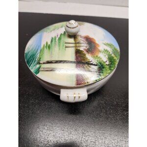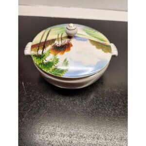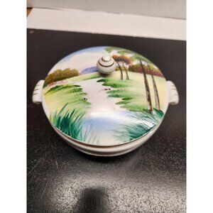 Vintage Hand Painted Porcelain Lidded Bowl With Scenic Landscape Design