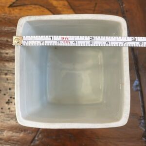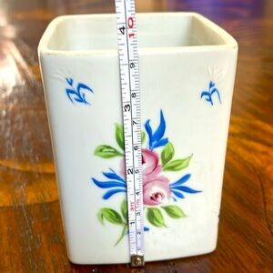 Beautiful hand painted pink roses and blue and white details on white porcelain make this romantic small vase great for display.