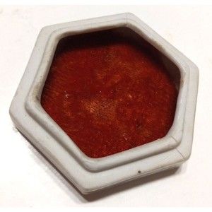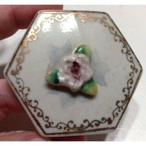 Vintage Hand Painted Porcelain Trinket Box Occupied Japan Floral Hexagon FLAW. this sweet little trinket or jewelry dish is 2.5 inches across in every direction. it features a hand painted floral design on top with a raised flower and gold flourishing around the border on the top. The bottom has been broken and repaired. It can not be seen from the top or the inside due to the velvet lining. It is just too sweet to not let it find a new home! Please see pictures for more details. *D 2