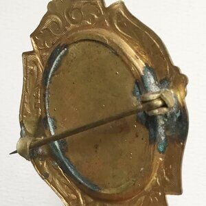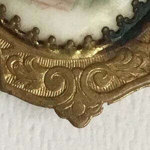 This brooch features a hand painted portrait of a woman on porcelain, which is prong set. It is set in a brass like material with a raised ornate pattern. The closure is a C-clasp.
