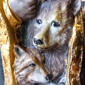 This beautiful, artistically painted Old World Santa with a cardinal on his shoulder, holding a lamb and with bear cub, wolf pup, racoon, bunny and squirrel peeking out from under his robe was made from a Provincial mold and painted and signed by Gloris Gikora. 8" tall, 4 3/4" wide at base, 3 1/2" deep at base. Hollow casting weights 14 ounces. Pre-owned in perfect vintage condition. No chips, cracks, flea bites or other visible signs ot use. The mold marks have been painted over but are still slightly visible through the paint. Interested, make an offer. From a smoke and pet hair free home. Fast shipping.
