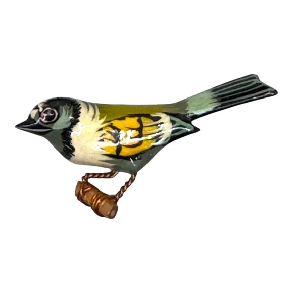 Vintage Hand Painted Takahashi Carved Wood Bird Pin Brooch 2.25" Green Yellow