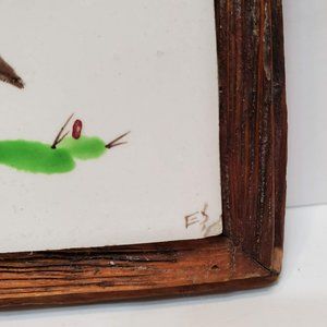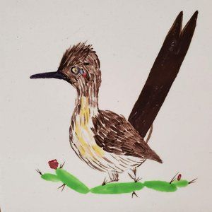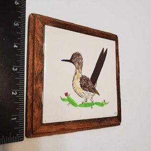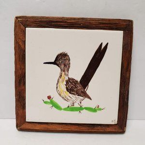 Lovely hand painting of a Roadrunner bird standing on a Cactus, signed by the artist, on a glazed white tile stamped MEXICO on the back. Framed in wood with a hanger on the back so it can be used as a wall hanging, or use as a trivet or hot mat on the table or in the kitchen. This is pre-owned, vintage, and it does have some wear / evidence of age, including a small chip on the tile corner next to the signature - see photos for condition. It is overall in good vintage condition. Measures about 5.5 inches square.