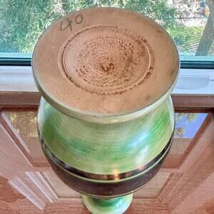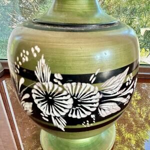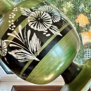 Vintage Hand Painted Wood Turned Vase – Tall Green and Black Floral Decor