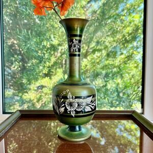 This vintage vase is crafted from wood and turned on a lathe, then hand painted with green, black, and white floral detailing. The tall, narrow neck flares into a wide rim, making it perfect for a single stem or as a decorative accent. Measures approximately 10.25” tall by 4' wide In very nice vintage condition.