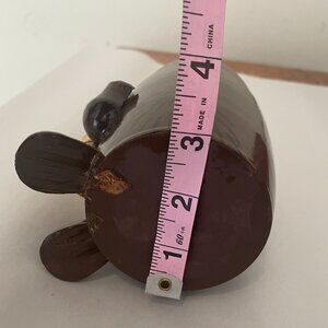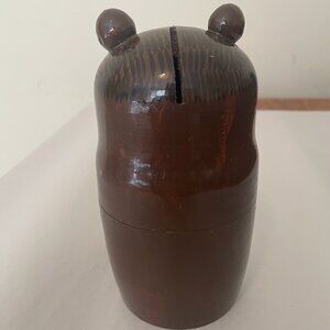 Charming vintage wooden bear piggy bank, hand-painted with adorable details and holding a little honey barrel. This collectible piece adds a cozy, rustic touch to any shelf or nursery while keeping spare change tucked safely inside.
