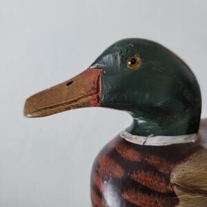 Vintage Hand Painted Wooden Duck Decoy Hand Carved Mallard Figurine Glass Eyes