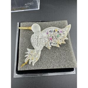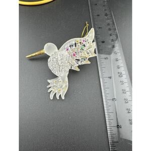 This Vintage Hand Spun Glass Hummingbird Ornament is a charming addition to any holiday décor collection. Measuring 3.5 inches in length and 2.5 inches in height, this small ornament features a beautiful hummingbird shape made of multi-colored glass. Handmade and embellished with a contemporary style, this decorative piece is perfect for Christmas and can be enjoyed by adults of all ages. The original production technique of hand-blown glass adds to the artisan quality of this unique ornament, making it a special addition to any ornament collection. It is new, in it's original box, but dates to the 1990s.