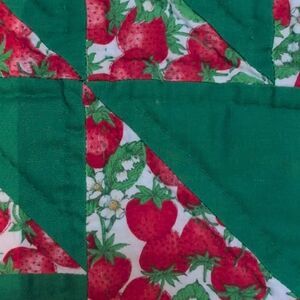 Vintage Hand Stitched Quilted Strawberry Placemats, Set of 4. One side of the placemats is hand quilted patches of strawberry and green fabric and the other side is all strawberry fabric. The edges are trimmed in 1/4" of the strawberry fabric.