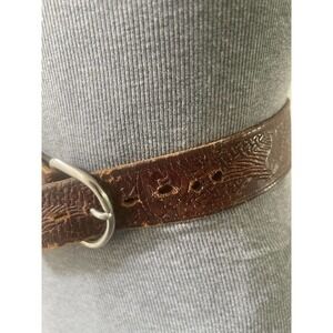 Add a rustic touch to your outfit with this vintage handmade buckle belt. Crafted from top grain leather, this Western-style belt features intricate hand tooling and buckle snaps for a secure fit. The rich brown color and classic design make it a versatile addition to your wardrobe, perfect for completing any Western-themed look.