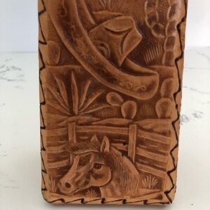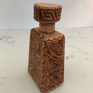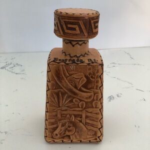 This vintage liquor decanter is a unique addition to any collection. The tapered shape and hand-tooled leather design make it a beautiful piece for display. The decanter comes with a screw on lid, making it easy to store and use.