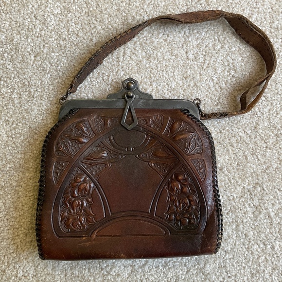 Vintage Hand Tooled Leather Metal Purse Early 1900s Antique