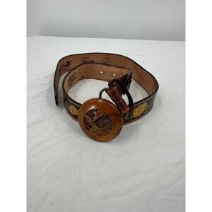 Vintage Hand Tooled Womens Belt Brown Yellow Roses Western Wooden Buckle Cowgirl
