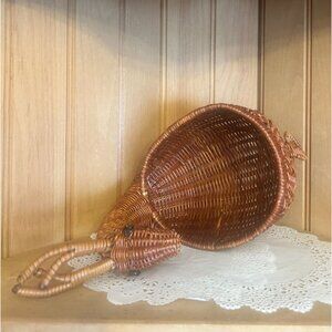 This unique vintage woven wicker basket features a charming reindeer design, adding an artistic touch to any space. Ideal for storing small items or as a decorative piece. The craftsmanship highlights the intricate weaving techniques, making it both functional and aesthetically pleasing.