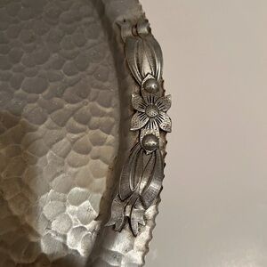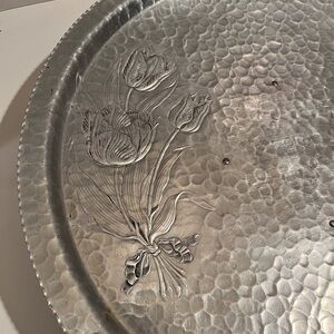 Beautiful and unique Hand Wrought Lazy Susan from Rodney Kent Silver Co. #412. Etched design is Tulips. Please zoom in on photos to see details. Diameter is 17.75in x H 3.25in.