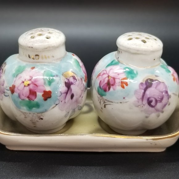 Vintage Hand painted Moriyama Mori-machi Ceramic Salt & Pepper Shakers with Tray