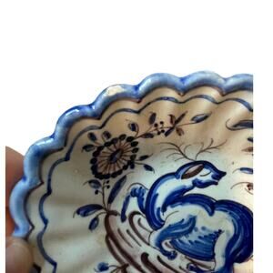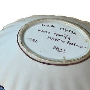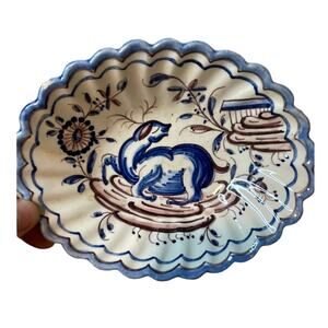 Vintage Hand painted Oval Scalloped Ceramic Trinket Dish Portugal Cream blue red