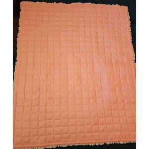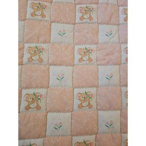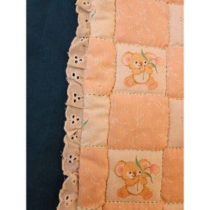 Pink colored crib comforter with teddy bear floral pattern. Lace trimmed edges. Pink underside. Tufted with square stitching. Excellent vintage condition, no tears!