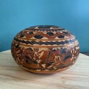 Vintage Hand-Carved Andean Gourd Box With Traditional Peruvian Design With Tags