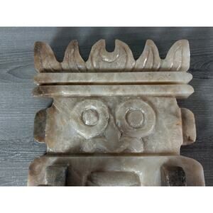 This unique vintage piece is a hand-carved stone wall mask with dual hooks, crafted from solid onyx/stone. The design is Aztec/Mayan inspired with tribal-style carved details, expressive facial features, and decorative crown-like top. Likely intended as a wall-mounted mask or functional hook for hanging items.
