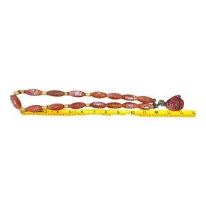 Elevate your style with this exquisite hand-carved necklace featuring rich red agate beads and green jade accents. Its vivid colors and intricate craftsmanship make it a standout piece to complement your wardrobe. The 24 inch length offers versatility for various occasions and outfits, making it a cherished addition to your jewelry collection.