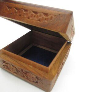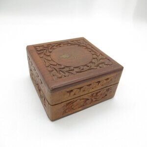 Vintage hand-carved wooden stash & jewelry box features an inlaid brass floral and leaf motif.