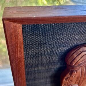 Beautifully crafted vintage wall art featuring a serene woman in a prayer pose, hand-carved from solid teak wood. Mounted on a textured black fabric backing and framed in coordinating wood, this piece measures 15” tall by 9.5” wide, by 1" in thickness. The warm tones and fine detail of the teak make this a striking and calming addition to any space. Ideal for boho, zen, spiritual, or global-inspired interiors. Excellent vintage condition with rich natural grain and character.