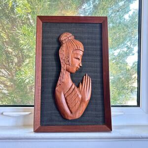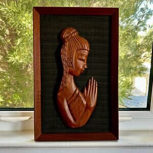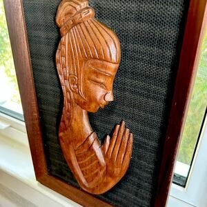 Vintage Hand-Carved Teak Woman Praying Buddha Wall Art, Prayer Pose Relief Panel