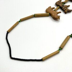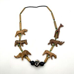 Unique artisan necklace featuring hand-carved wooden safari animals with bamboo beads and tribal accents.