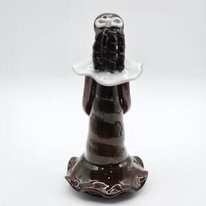 Hand-Crafted Faceless Woman with Flowers Ceramic Figurine Artisan Glazed. Colors are brown, white, and hints of blue. Expertly crafted from high-quality stoneware, this piece boasts exquisite detailing in both form and glaze. Perfect as a statement piece for your mantel, bookshelf, or side table - a sure conversation piece. Its design complements a variety of interior styles, from modern minimalist, primitive, to eclectic bohemian. It is not artist signed.