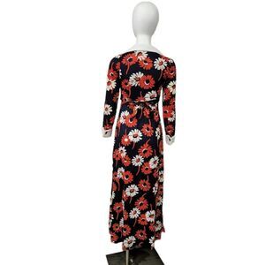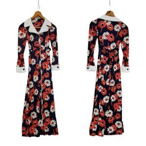 Vintage Hand Crafted Large Floral Print Design. colors are blue ,white and red. was a built in sash. the color and cuffs have lace trim edging