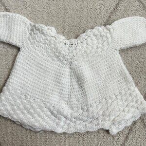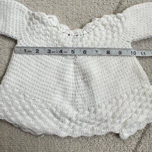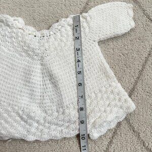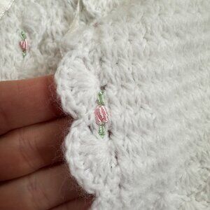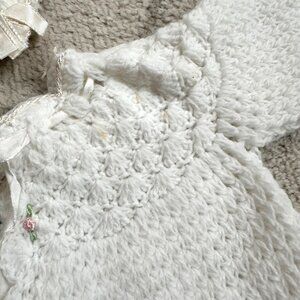 Delicately handcrafted, this vintage baby set includes a matching bonnet and booties adorned with pink embroidered flowers and charming scalloped edges. Made with care and timeless craftsmanship, it's a beautiful heirloom-quality piece—perfect for special occasions, photo sessions, or cherished keepsakes.